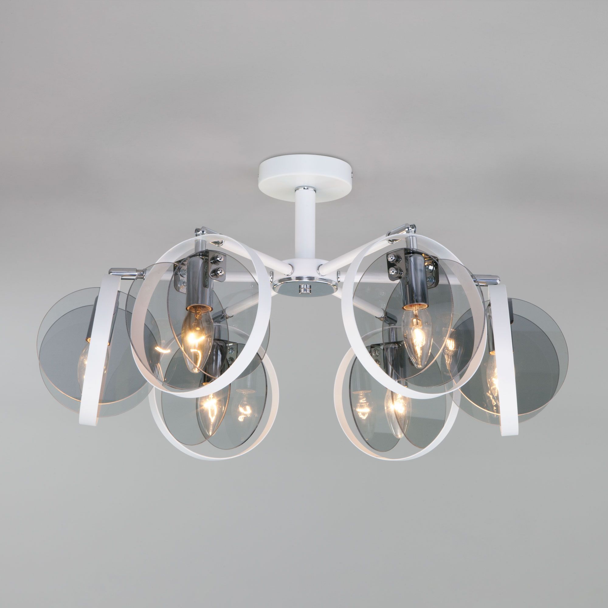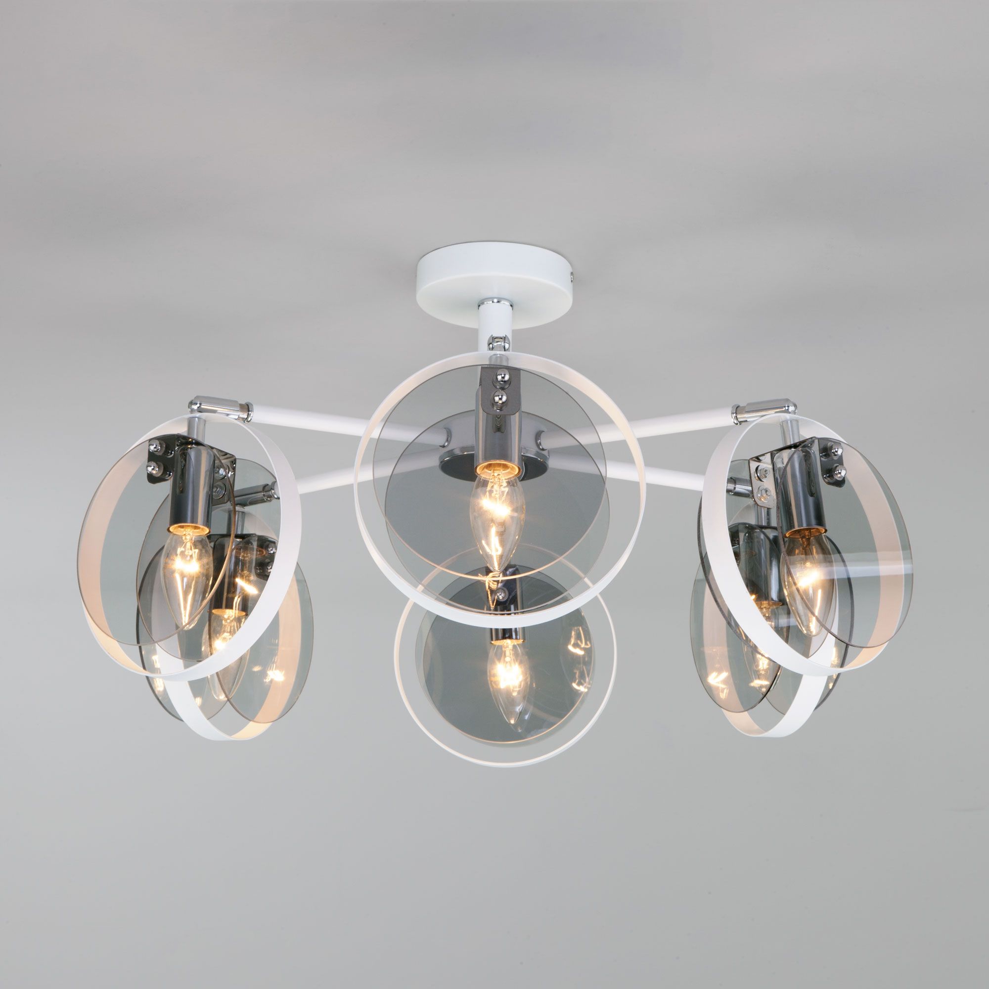 В люстре используются сменные лампы с цоколем E14, рассчитанные на максимальную мощность 60 Вт. Потолочный светильник оснащен стеклянными плафонами и поворотным механизмом, позволяющим направлять световой поток в нужном направлении.