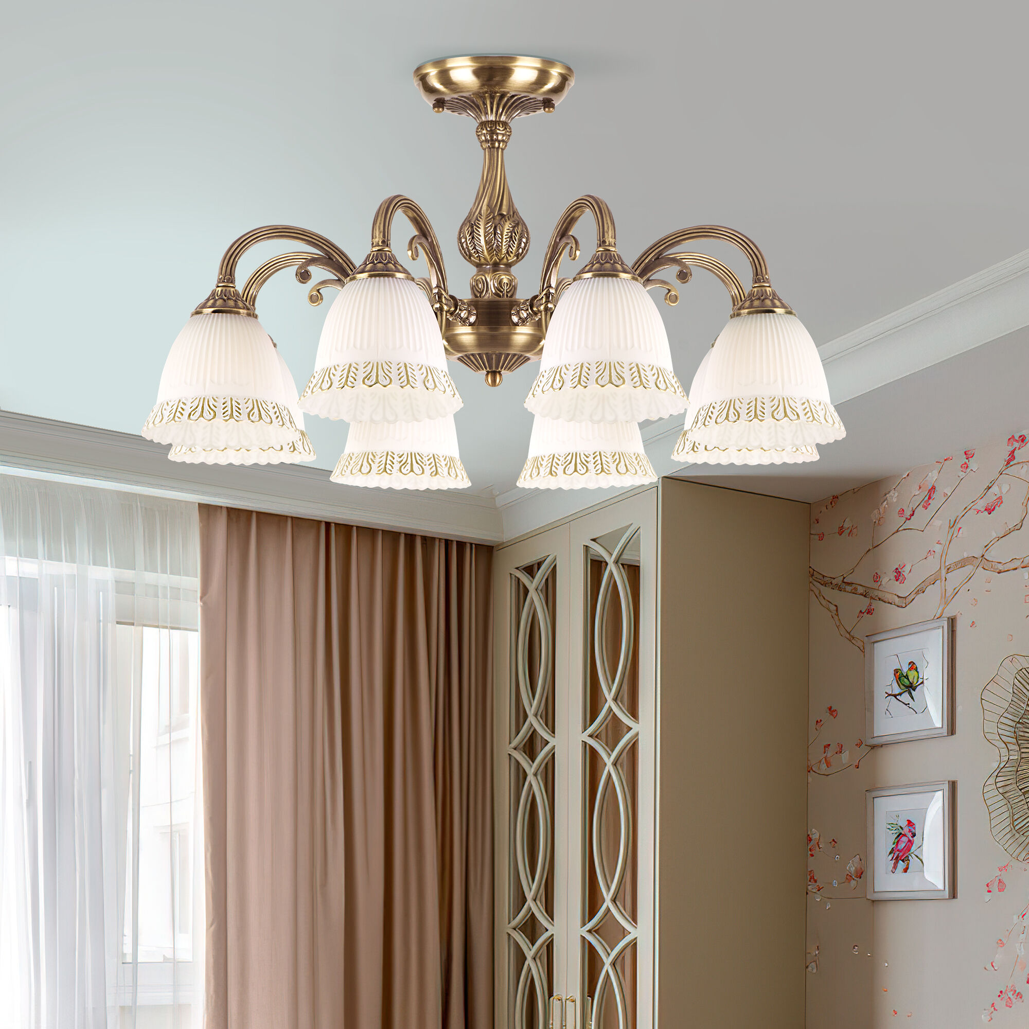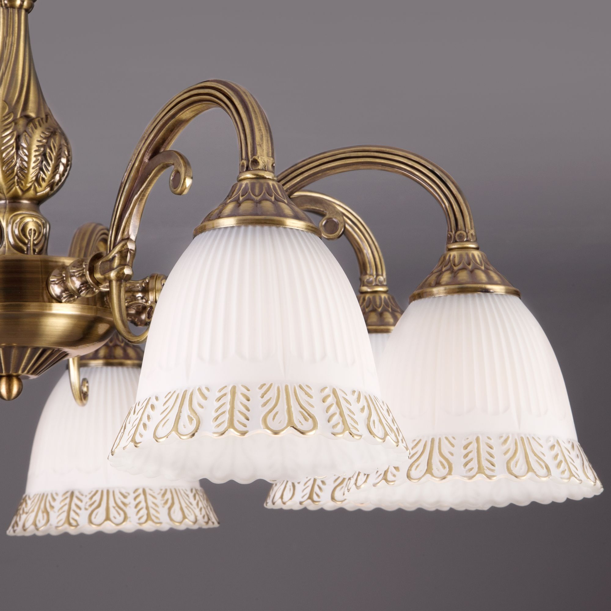 ПодробнееКлассическая люстра со стеклянными плафонами 60107/8 античная бронза из коллекции Campina предназначена для создания основного освещения в современных и классических интерьерах. Изящные линии и детали в стиле ретро придают люстре неповторимый шарм и элегантность. Плафоны из матового стекла с золотистым орнаментом обеспечивают равномерное и приятное освещение. Люстра осветит помещение площадью 21 м².
