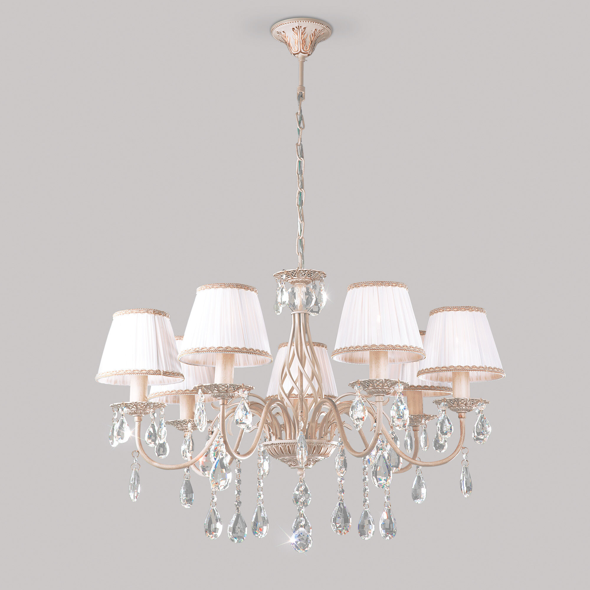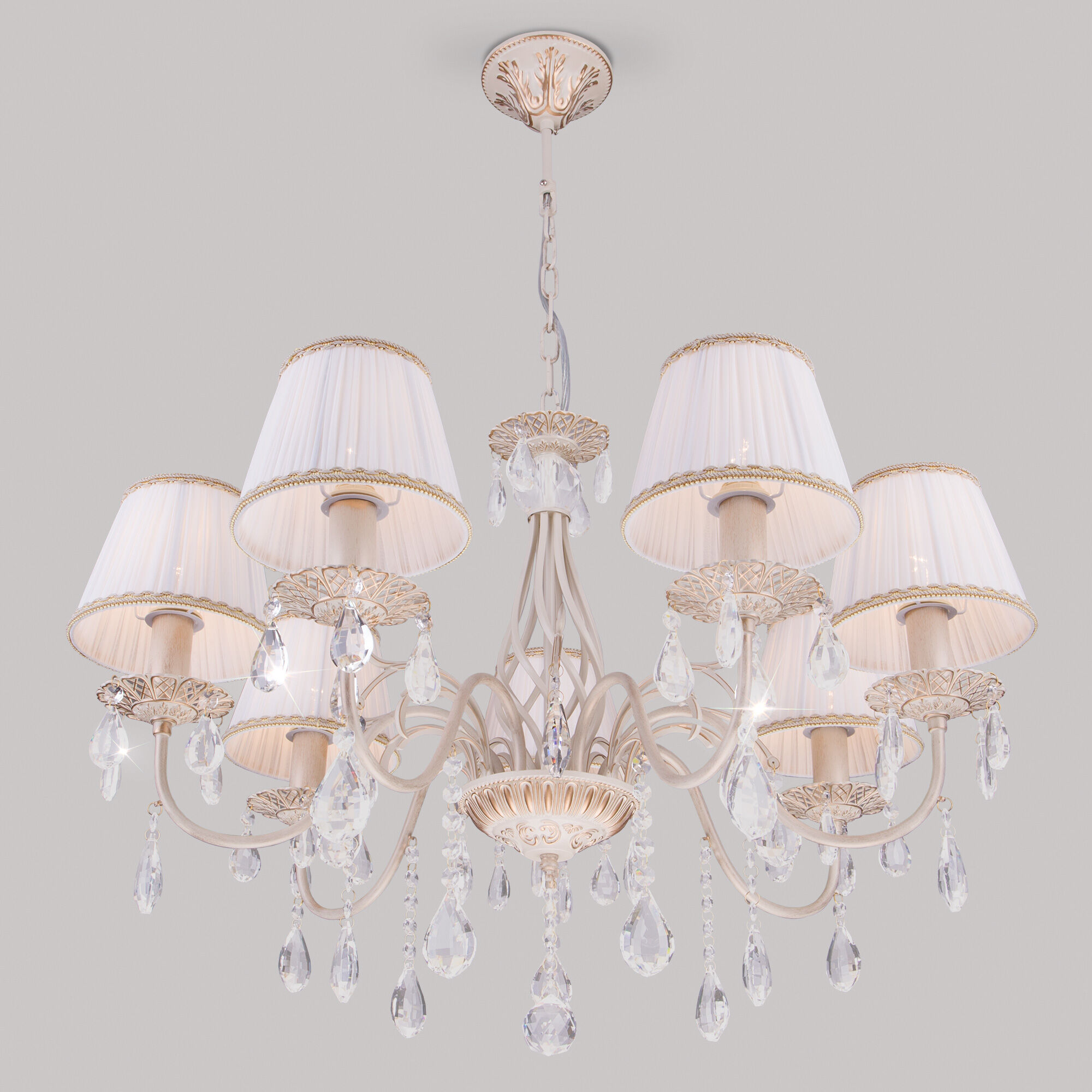 Подвесная люстра с хрусталем и абажурами 3637/7 белый с золотом / прозрачный хрусталь предназначена для создания основного освещения в современных и классических интерьерах, подходит для различных типов помещений: гостиная, спальня и рассчитана на площадь освещения 22 м².