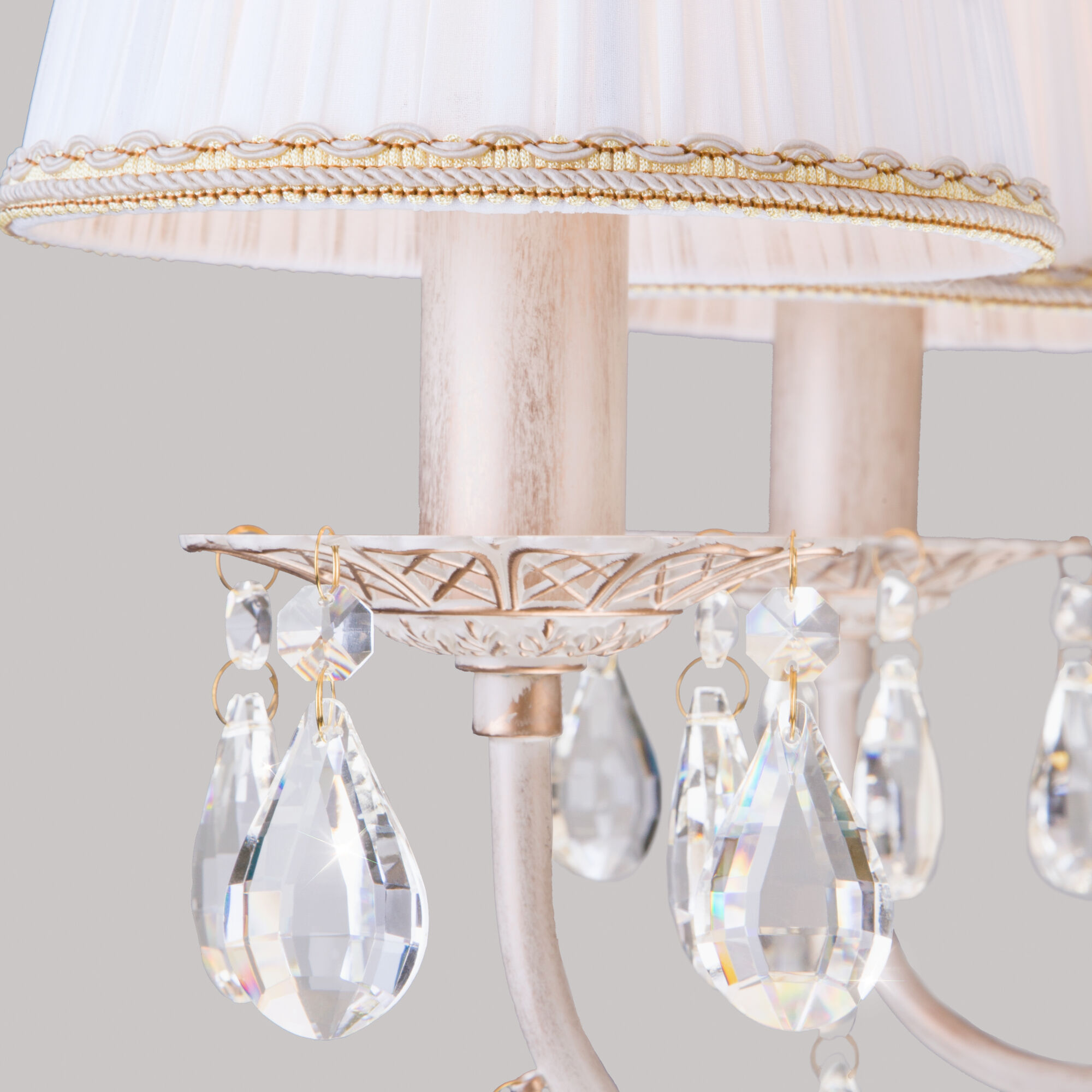 Роскошная люстра оснащена патронами с цоколем Е14, которые рассчитаны на максимальную мощность ламп 40 Вт. Люстра украшена эффектным декором из хрусталя и дополнена выразительными тканевыми абажурами. Арматура изготовлена из высококачественного металла с надежным защитным покрытием.