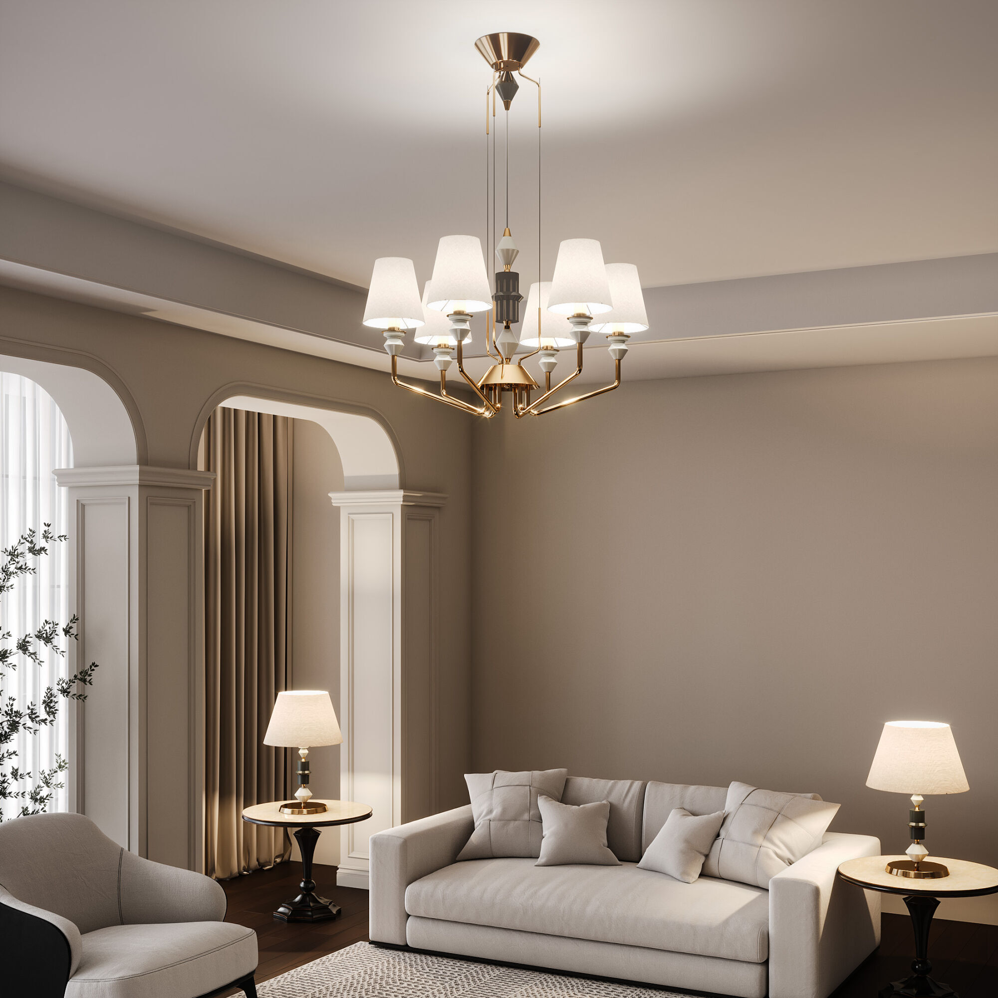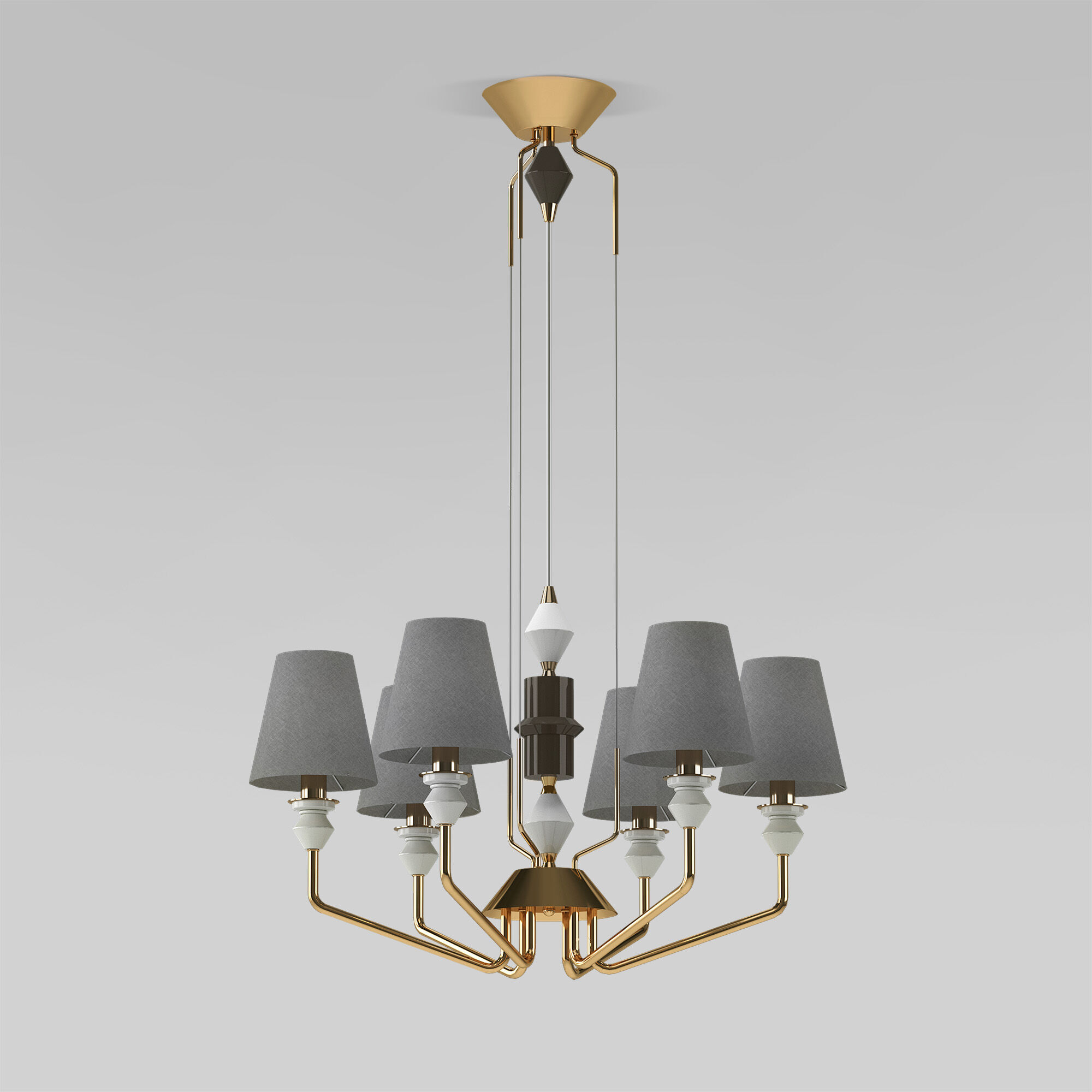 Каркас люстры с его плавными линиями добавляет роскоши и изысканности, а абажуры из ткани создают мягкое освещение. Декоративные элементы в центре люстры, выполненные из керамики в контрастных цветах, придают ей оригинальность и подчеркивают внимание к деталям.