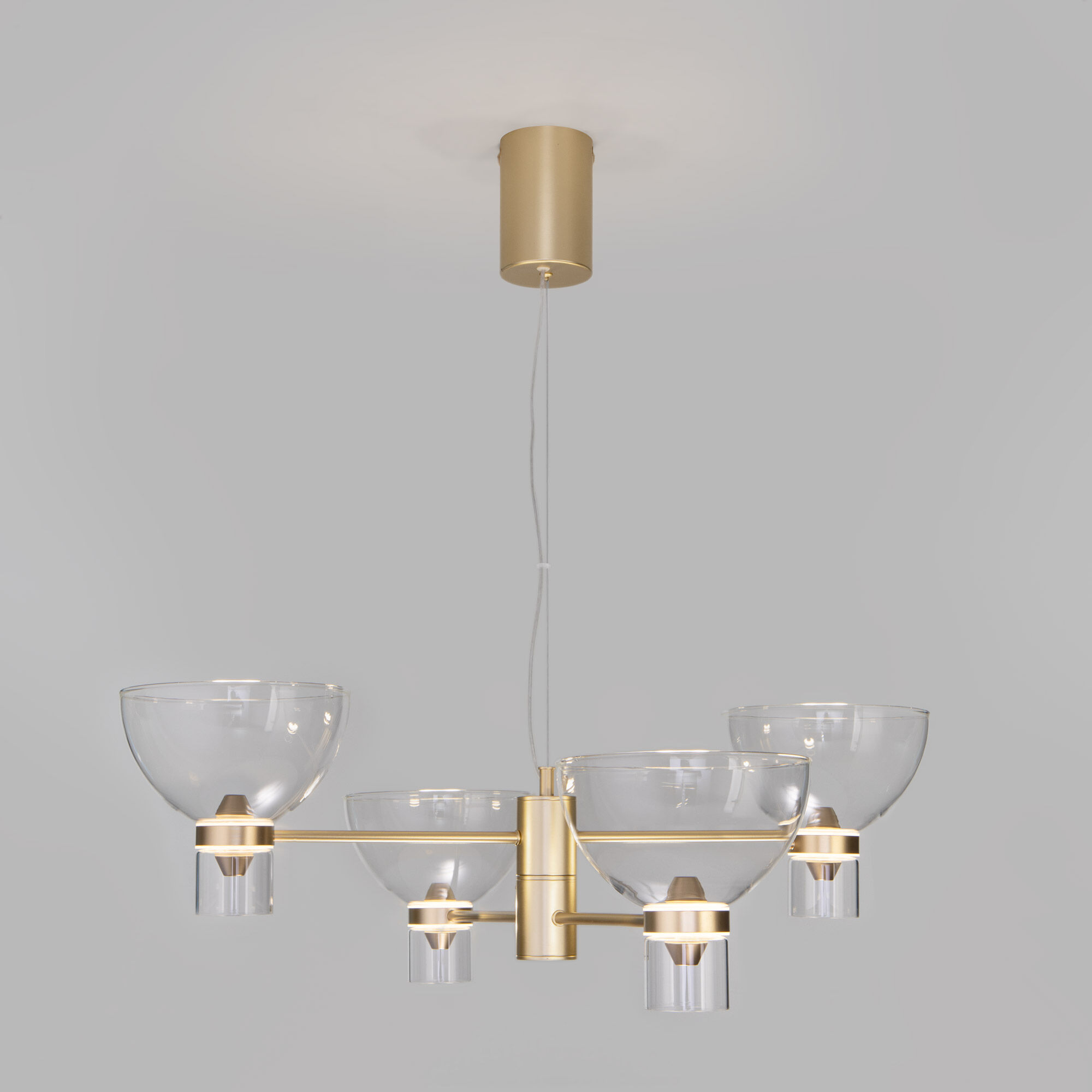 В выключенном состоянии светильник притягивает к себе внимание за счет продуманной геометрии и баланса плафонов. В включённом — настоящее световое представление: свет мягко переливается в гранях и наполняет пространство тёплым, рассеянным сиянием.