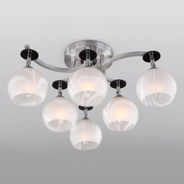 Потолочная люстра с белыми плафонами 9643/6 алюминий/белый предназначена для создания основного освещения в современных и классических интерьерах, подходит для различных типов помещений и рассчитана на площадь освещения 24 м².