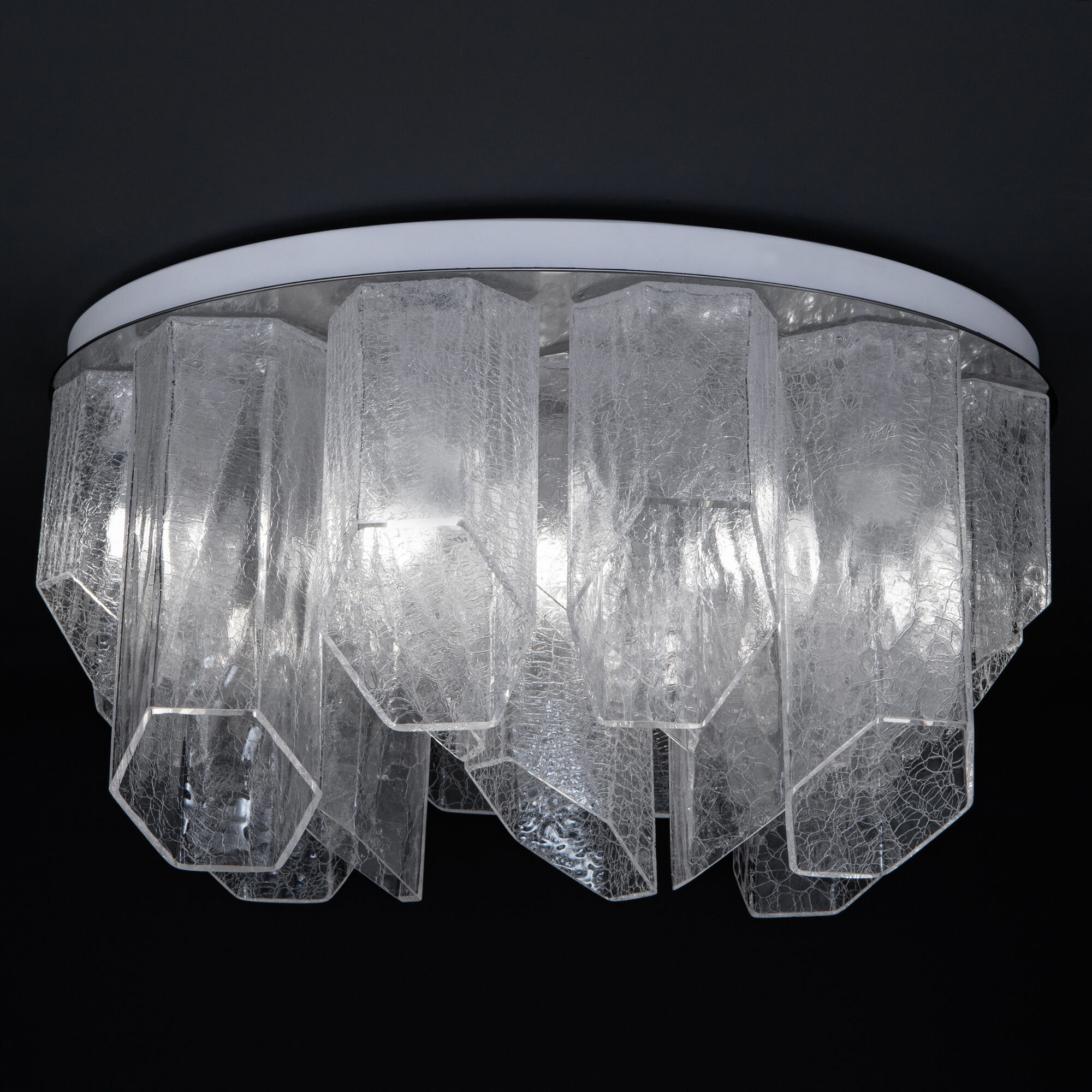 Потолочный светильник с плафонами из фактурного стекла станет ярким элементом в интерьере, который будет притягивать внимание благодаря своему асимметричному дизайну. Утонченная конструкция объединяет в себе плафоны разных размеров из фактурного стекла, которые закреплены металлическом каркасе в цвете никель. В модели используются сменные лампы с цоколем E27. Минималистичный стиль потолочного светильника отлично дополнит современный интерьер кухни, гостиной или спальни.