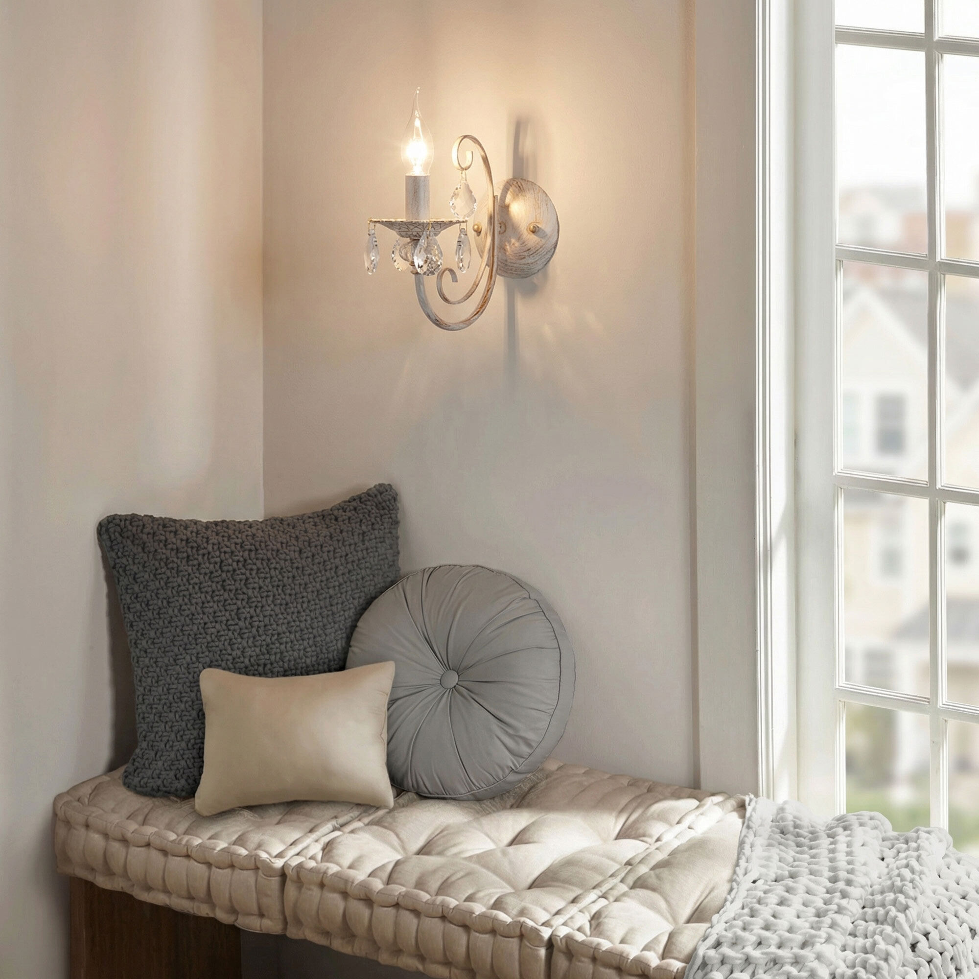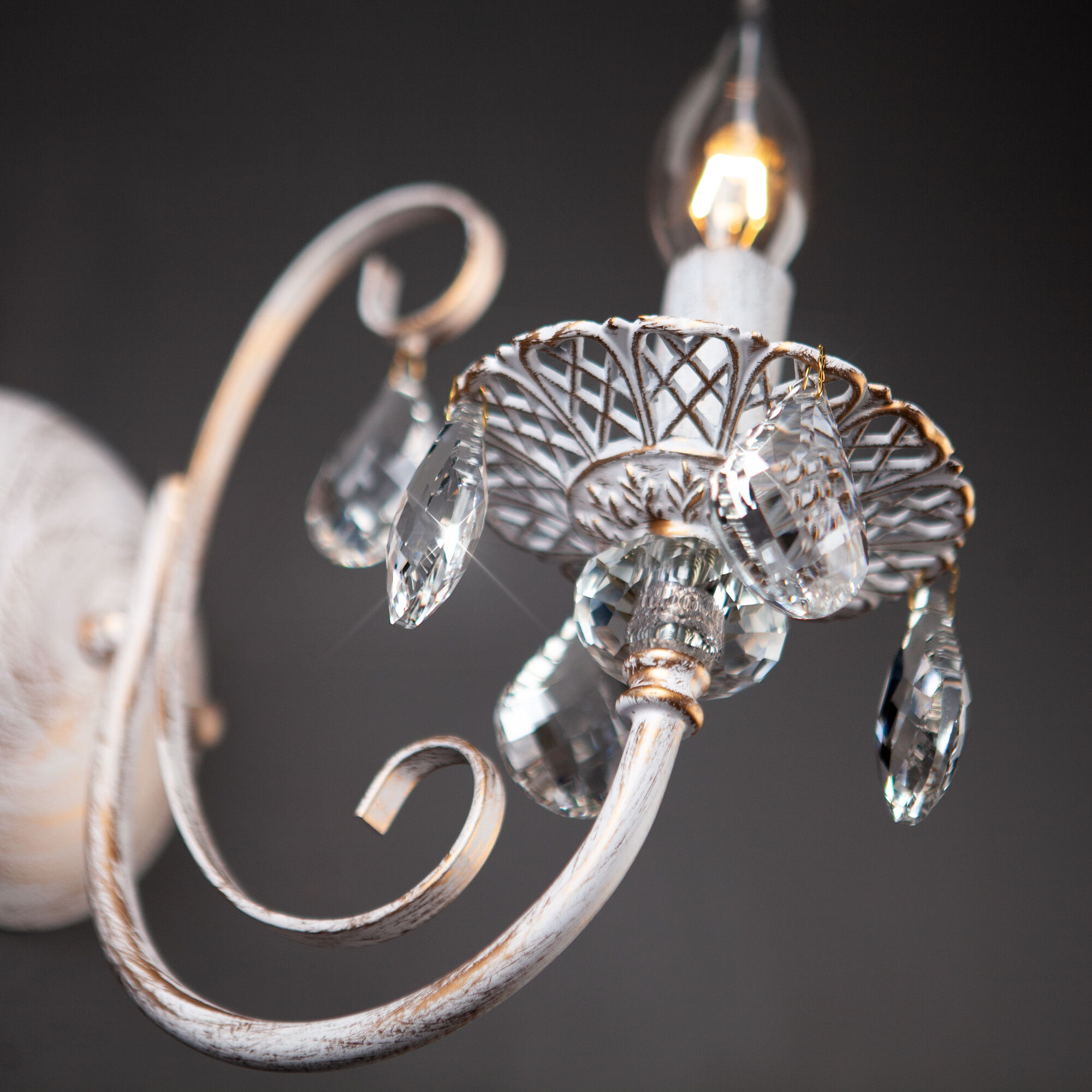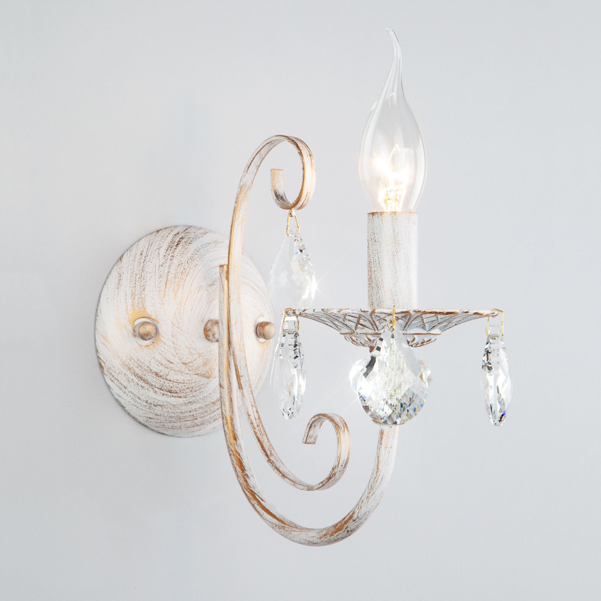 Бра с хрусталем 3305/1 белый с золотом / прозрачный хрусталь станет ярким световым акцентом в классических интерьерах и создаст качественное освещение на площади 3 м². Эффектный светильник украшен хрустальными подвесками, которые искрятся в лучах света, наполняя помещение выразительным блеском. В качестве источника света используются сменные лампы типа с цоколем E14.