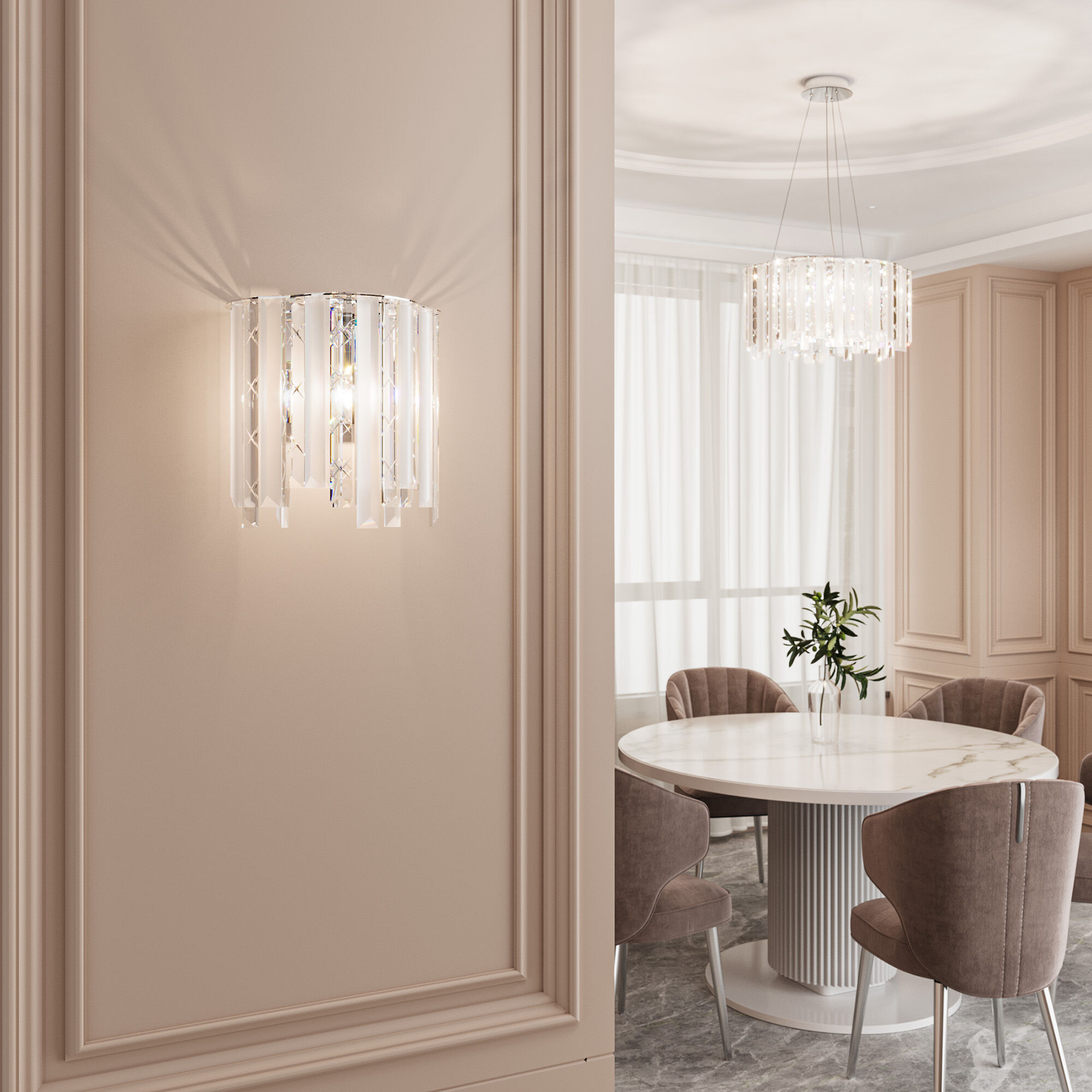 Элегантный настенный светильник 101011 хром станет ярким акцентом в вашем интерьере. Его утонченный дизайн, сочетающий в себе прозрачный и матовый хрусталь, создает завораживающую игру света и тени, наполняя комнату мягким и приятным освещением.