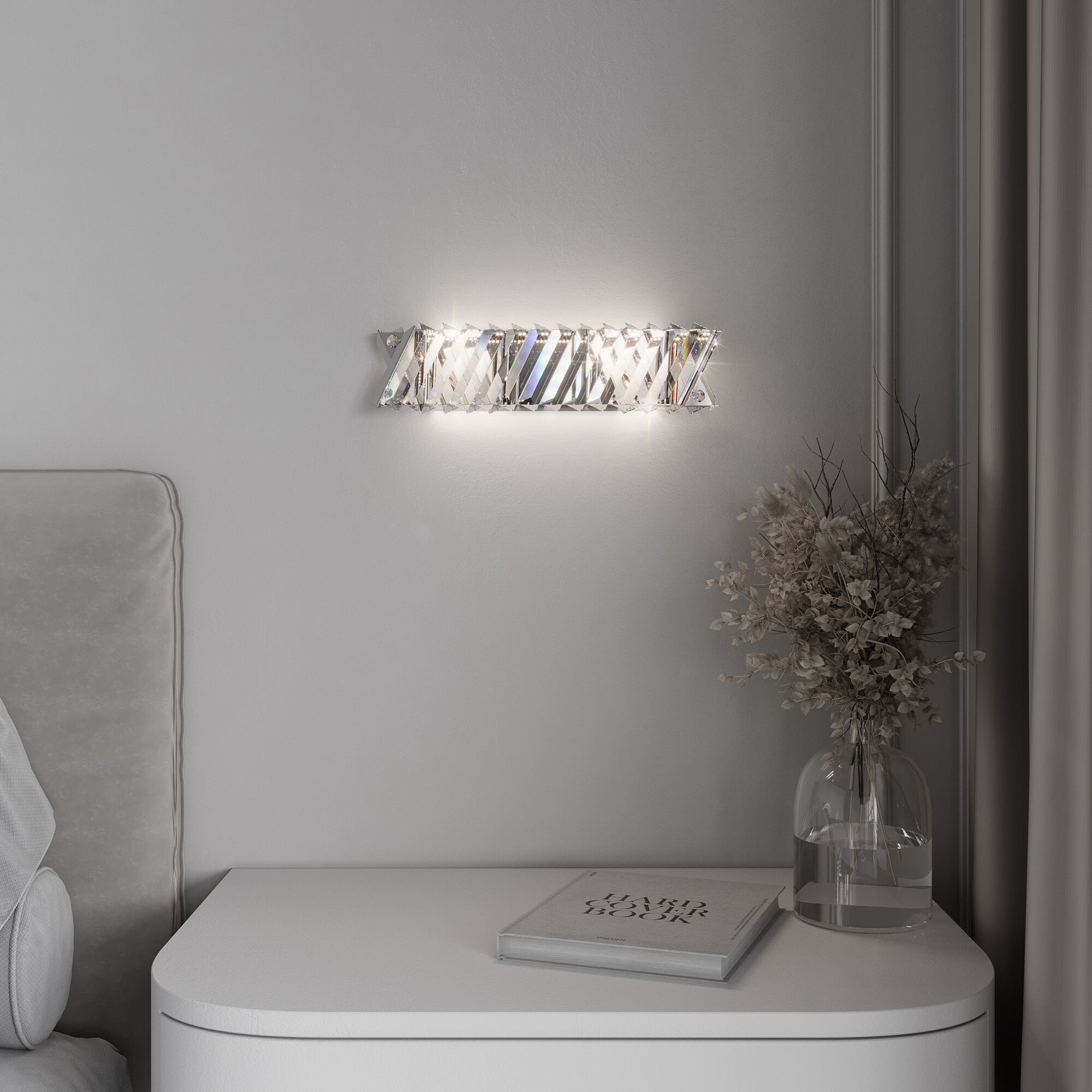 Добавьте нотку роскоши и сияния в свой дом с помощью элегантного настенного светильника 101005 LED. Его геометрический дизайн, состоящий из множества хрустальных элементов, преломляет свет, создавая завораживающую игру бликов и теней на стенах.