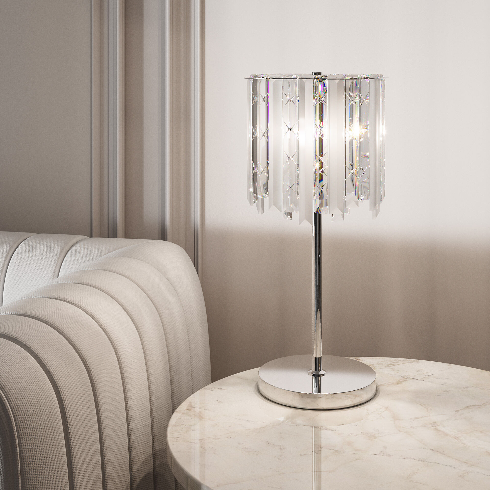 Настольная лампа с хрусталем 108011 хром является главным атрибутом для создания качественного освещения настольного рабочего пространства и может использоваться, как дополнительный источник света в прикроватной зоне. В светильнике используется сменная лампа E14 с рекомендованной максимальной мощностью 40 Вт.