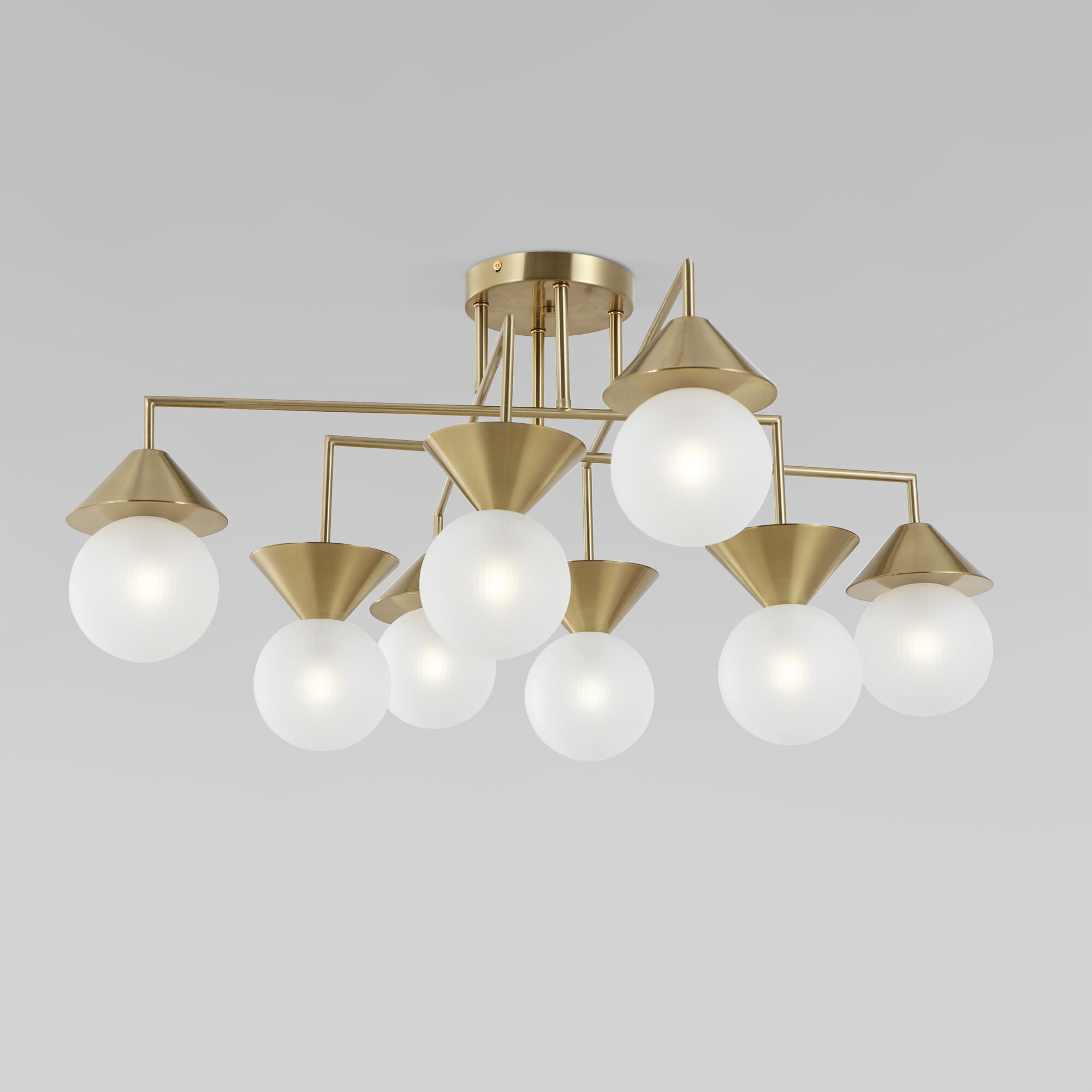 Умная потолочная люстра из коллекции Melon с легкостью преобразит любое пространство, добавив нотку изысканности и стиля. Ее лаконичный дизайн с акцентом на геометричные формы и благородный оттенок металла создают впечатляющий визуальный эффект. Люстра украшена эффектными стеклянными плафонами с пескоструйным напылением, благодаря чему поверхность плафона приобретает матовую фактуру с тонким узором.