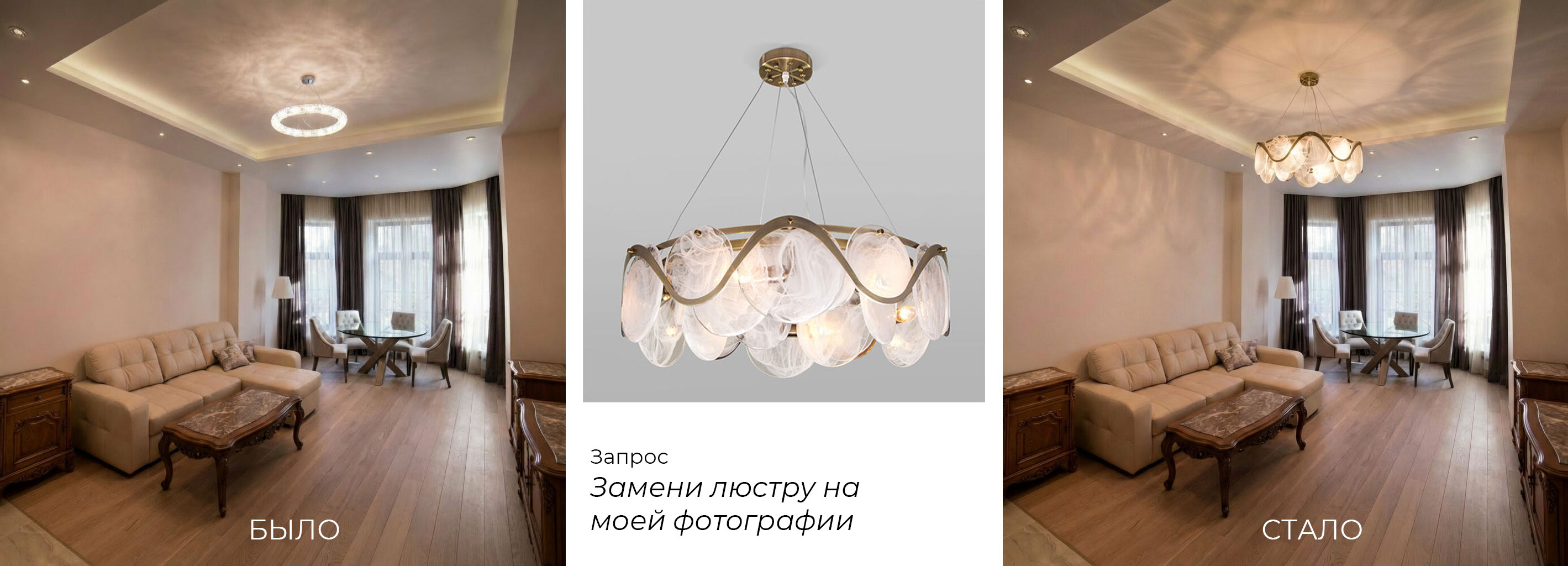 Сделайте фото помещения, загрузите его в примерочную и укажите в запросе "замени светильник на моей фотографии".