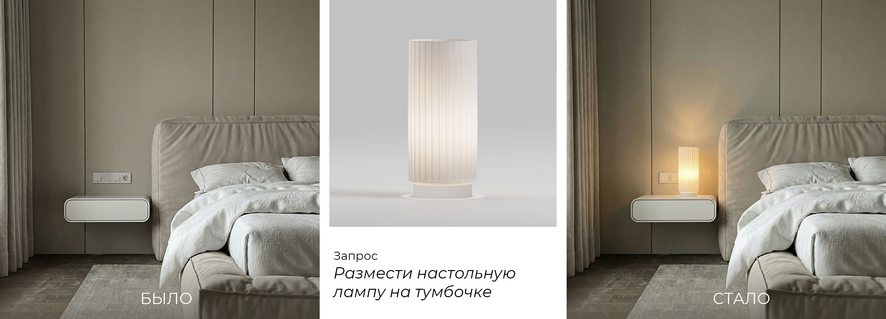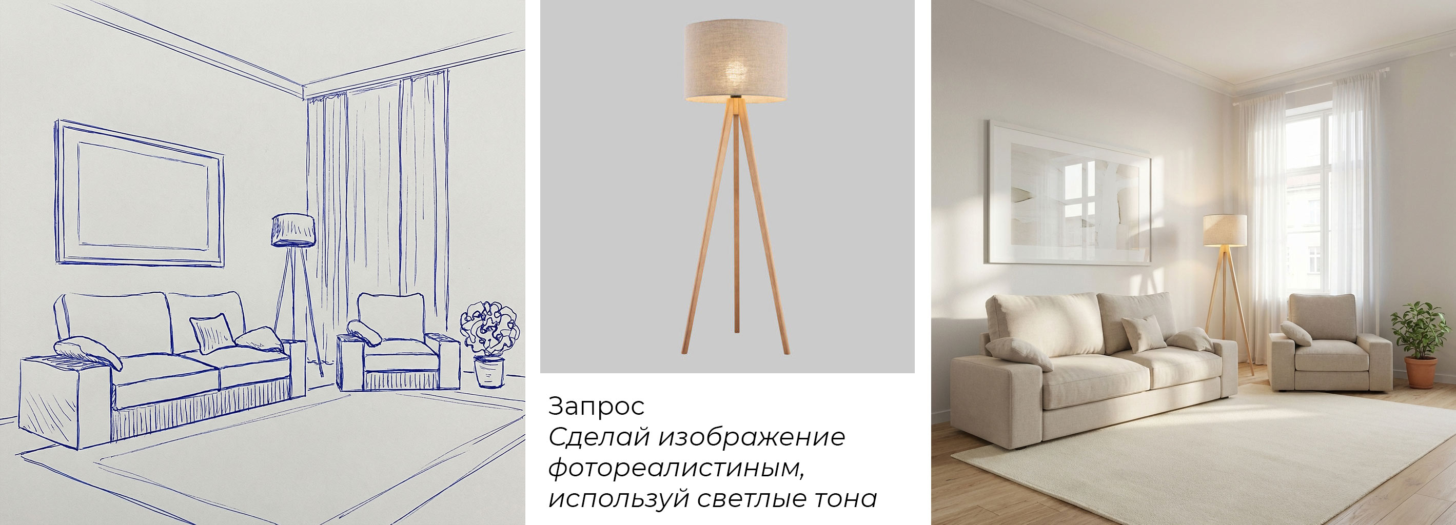 • Старайтесь делать фото помещения так, чтобы место прилегания основания светильника было в кадре. Это поможет показать продукт в более правильном масштабе и корректно позиционировать его.