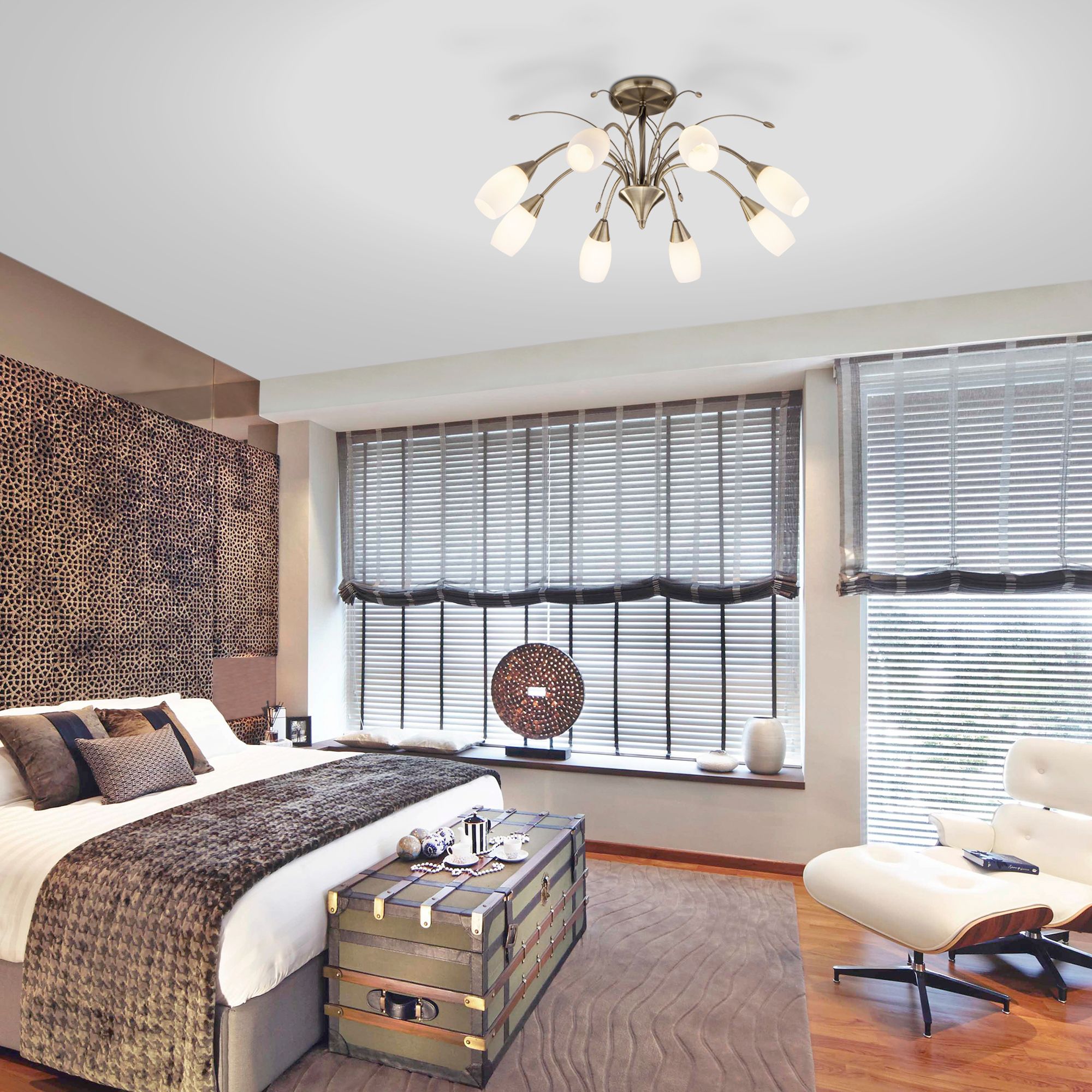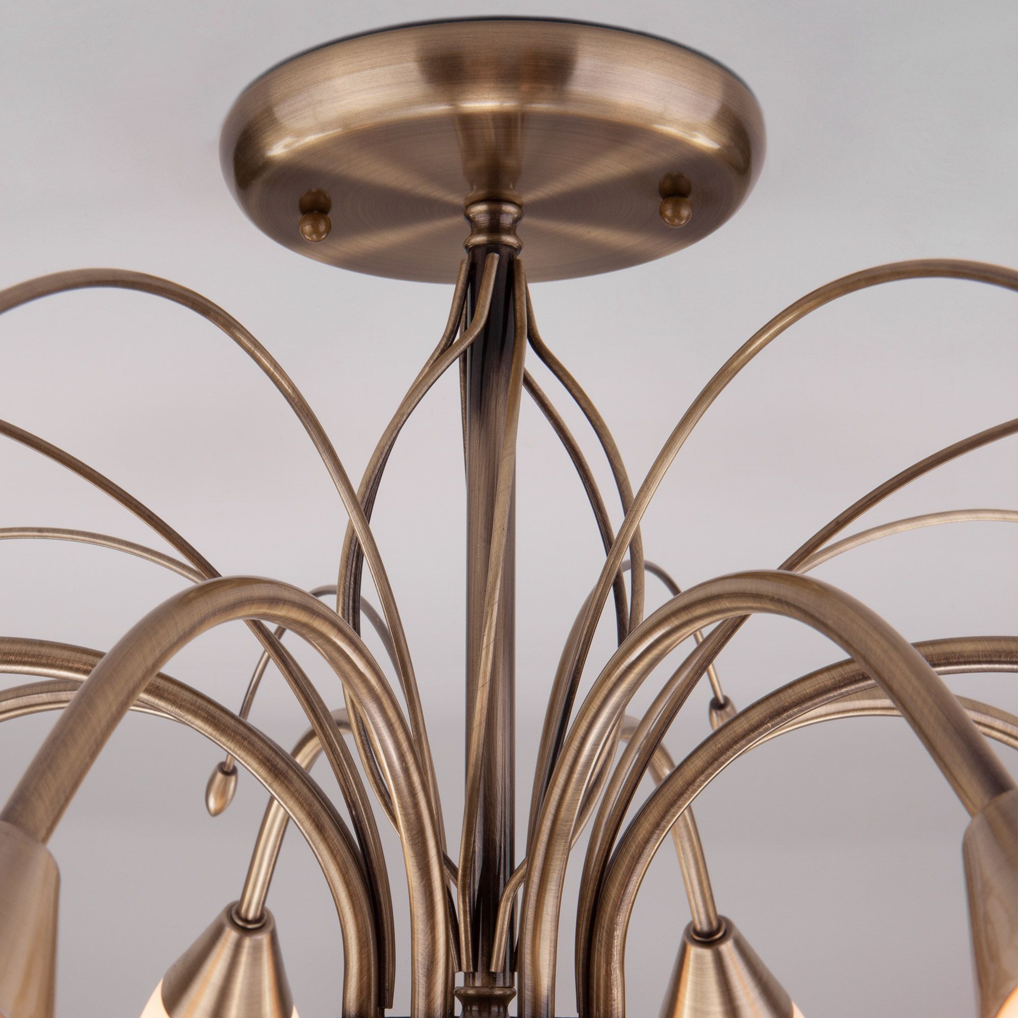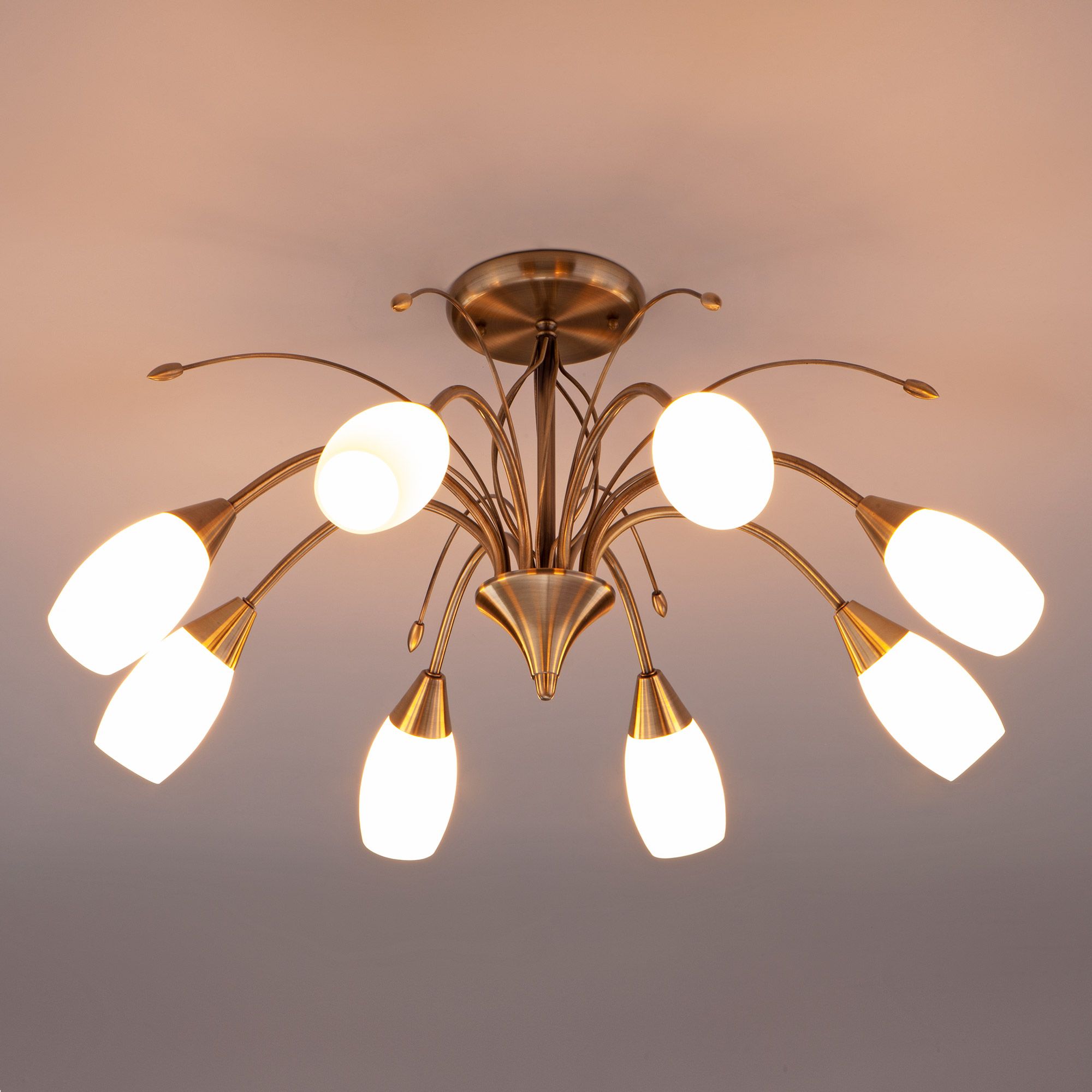 Организовать качественное освещение вам поможет современная потолочная люстра со стеклянными плафонами 30280/8 античная бронза из коллекции Ginevra. Ее изящные линии и бронзовый оттенок арматуры создадут атмосферу благородства и утонченности, а матовые плафоны в форме бутонов одарят мягким, приятным для глаз светом, создавая комфортную и расслабляющую обстановку.