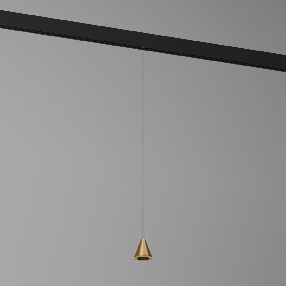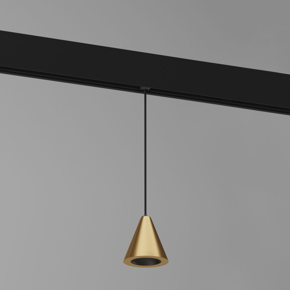 Магнитный трековый светильник Event – это трендовое сочетание лаконичной формы конуса и премиального цвета латунь. Конструкция закреплена на тонком регулируемом тросе, что придает модели эффект легкости и невесомости в пространстве.