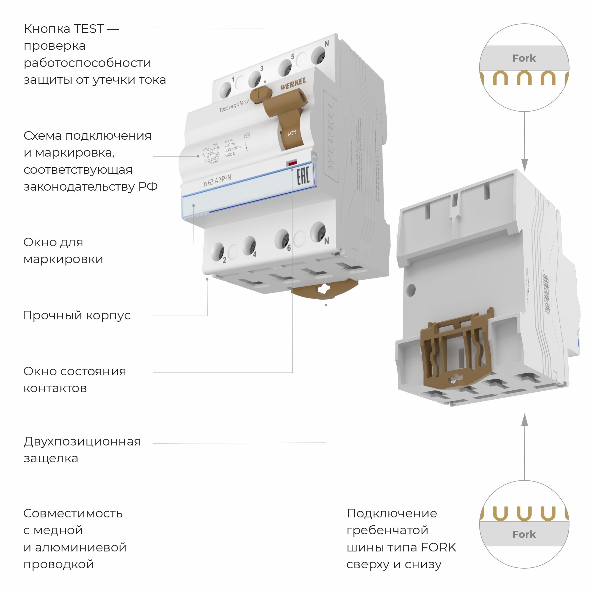 Устройства защитного отключения Werkel совместимы с гребенчатыми шинами PIN и FORK. Подключение возможно, как к медным, так и к алюминиевым проводам.