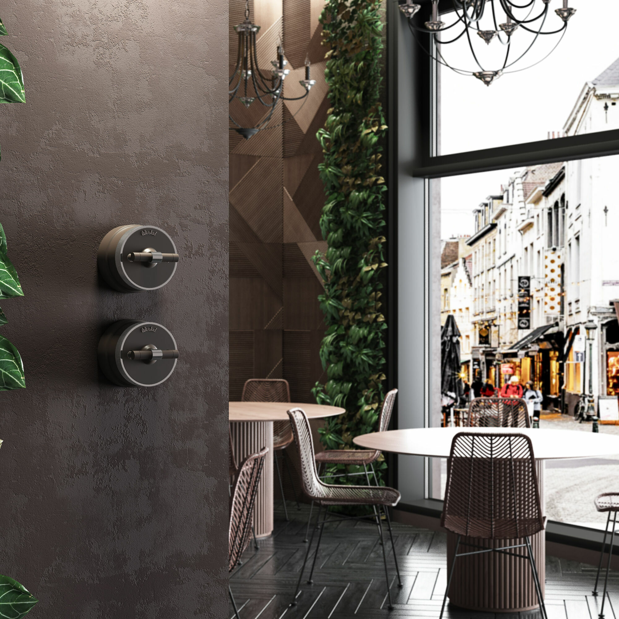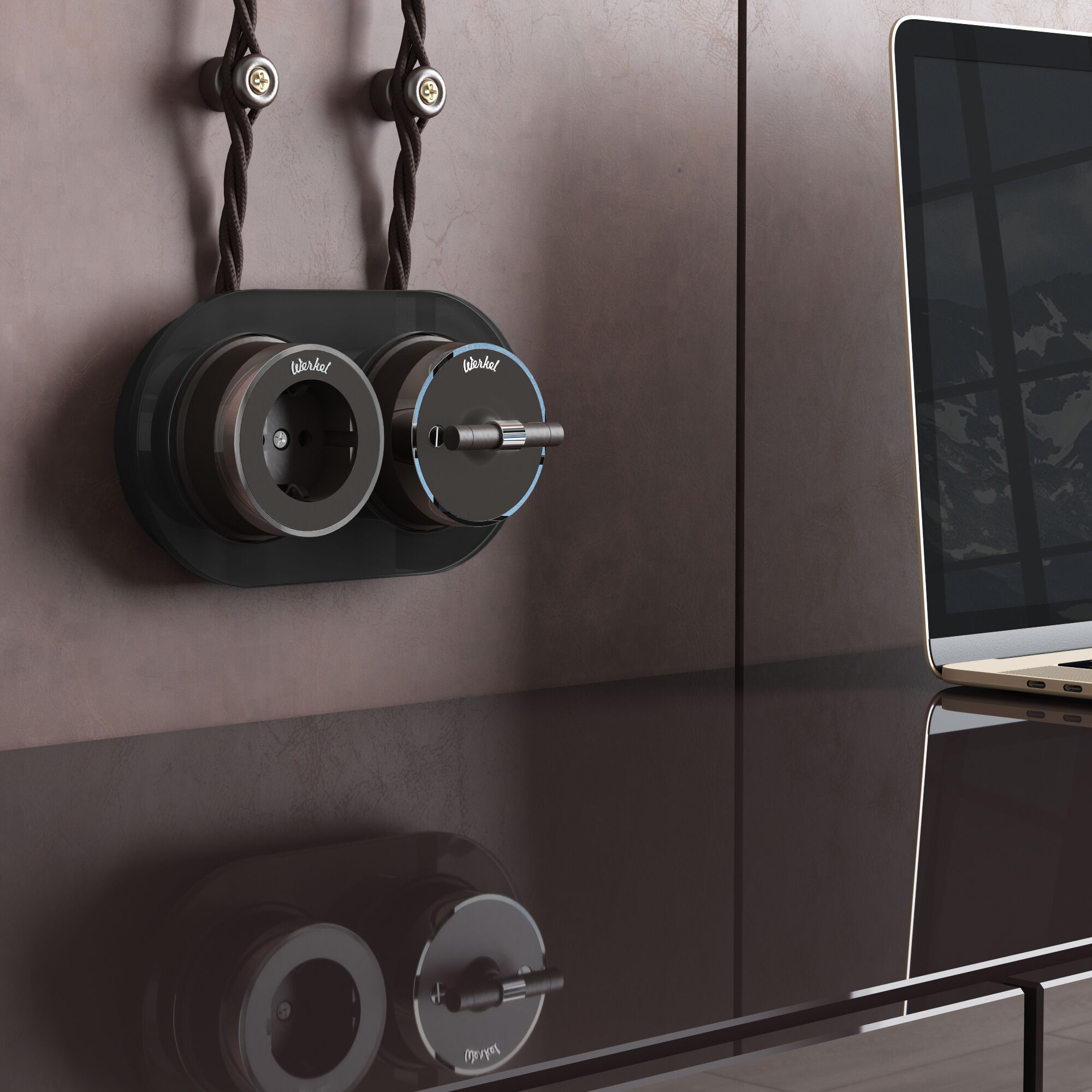 Дополнить образ помогут рамки Werkel из металла, стекла, и дерева, а так же аксессуары для накладного монтажа проводки.