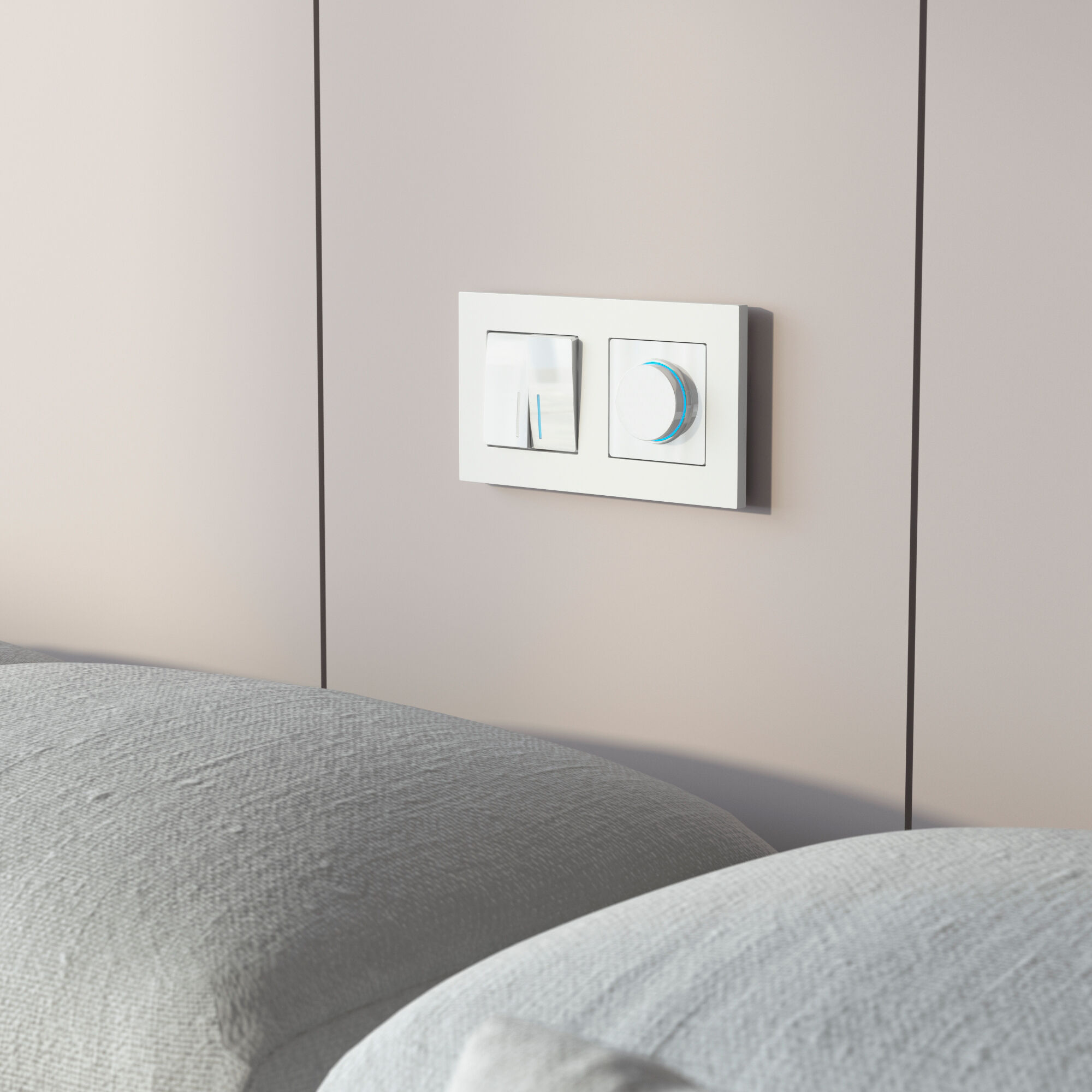 Диммер предназначен для изменения уровня яркости света. Поворотная кнопка регулирует интенсивность светового потока. Включение и выключение производится нажатием на кнопку. Диммер совместим со светодиодными диммируемыми лампами и лампами накаливания.