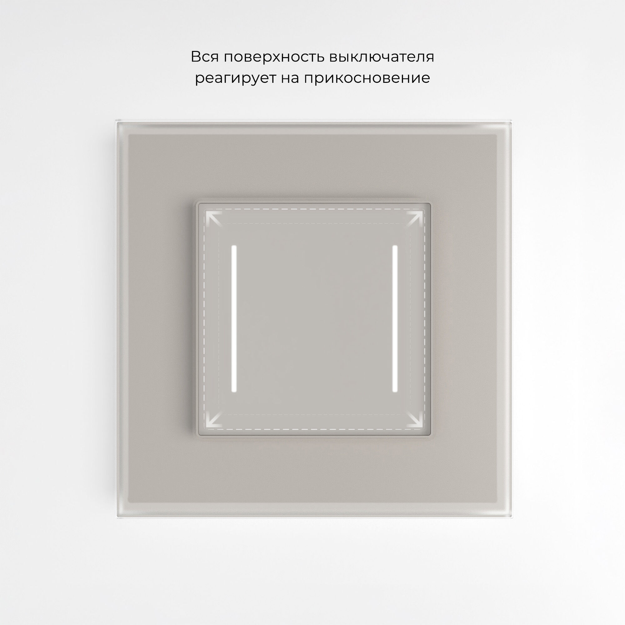 Сенсорный выключатель имеет стеклянную поверхность Soft-touch, которая обладает приятным тактильным эффектом. За счет матового фактурного покрытия лицевая панель не бликует и на ней не остается следов.