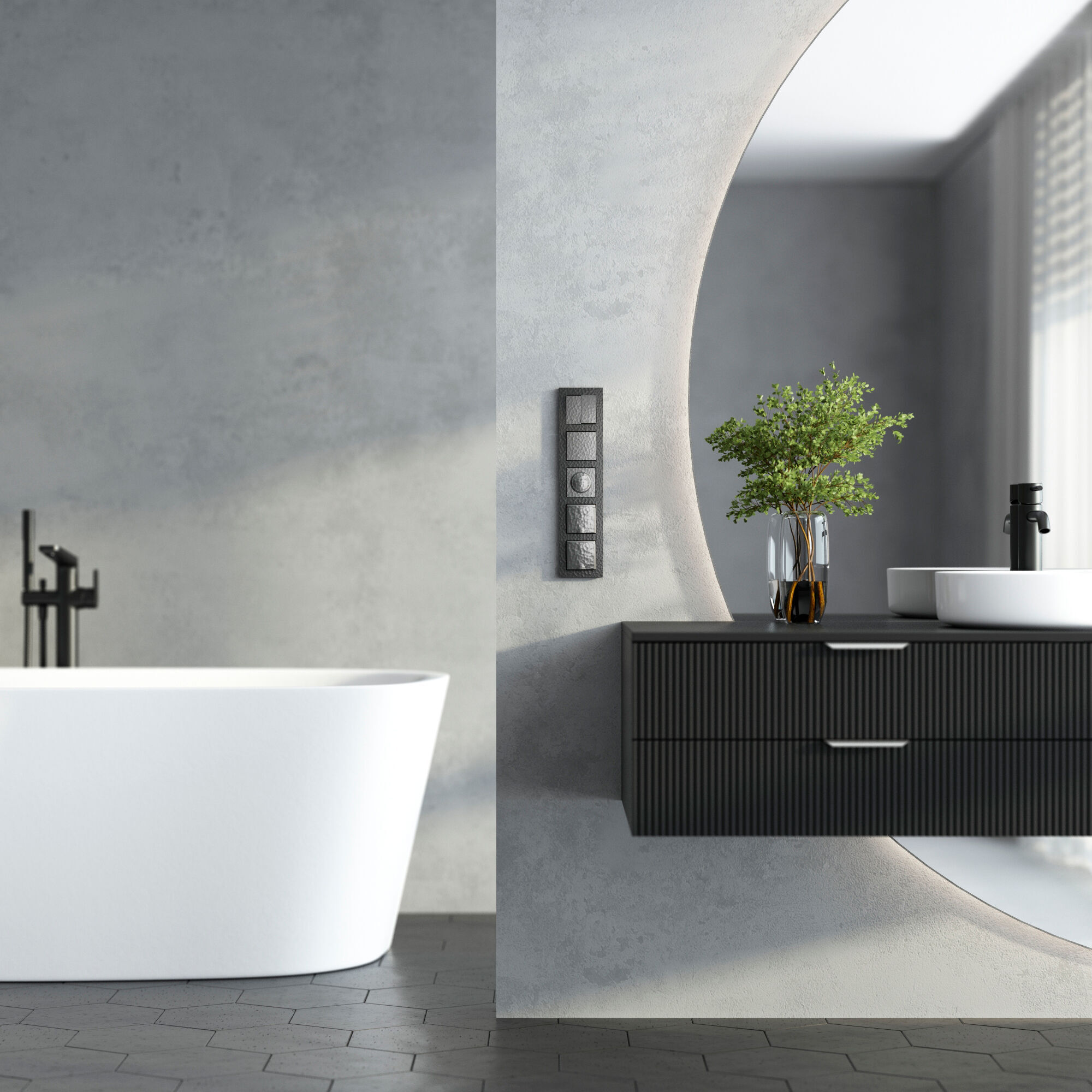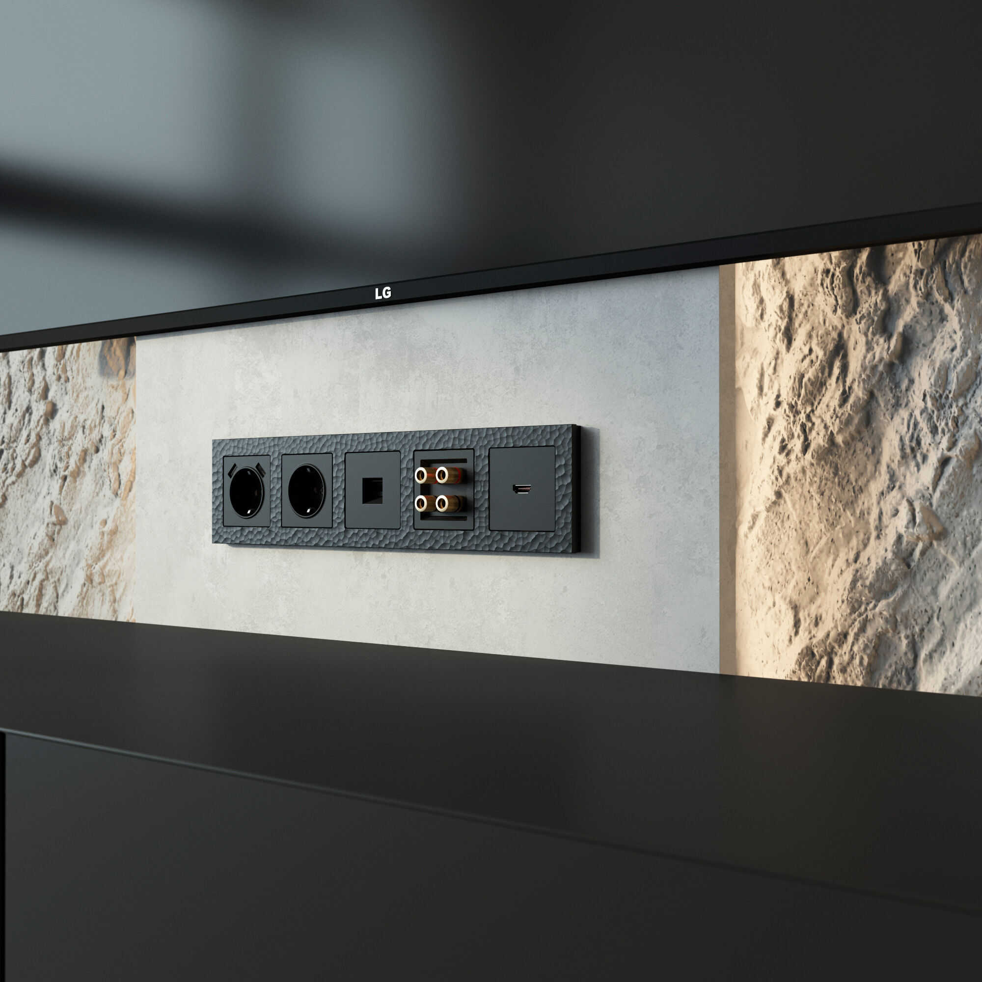 Серия электроустановочных изделий Hammer — это уникальное сочетание природной эстетики и современной функциональности. Её фактура, вдохновлённая естественными текстурами камня, создаёт поразительный визуальный эффект: на первый взгляд она кажется простой и лаконичной, но при ближайшем рассмотрении раскрывается сложной игрой рельефа и оттенков.