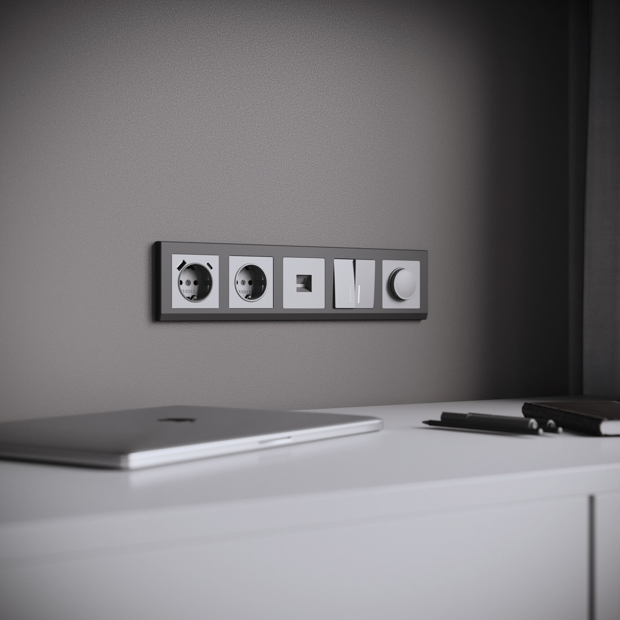 Коллекция Stark представлена моделями от одного до пяти постов, а также рамкой для двойной розетки. Коллекция совместима с любыми встраиваемыми механизмами Werkel.