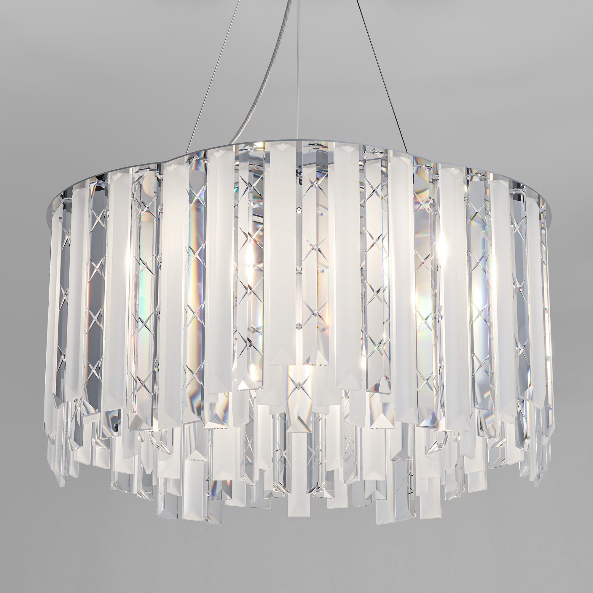 Декоративные хрустальные элементы переливаются на свету искристыми завораживающими бликами благодаря лампам с цоколем E14. В производстве подвесной люстры использовали хрусталь и высококачественный металл с надежным защитным покрытием.