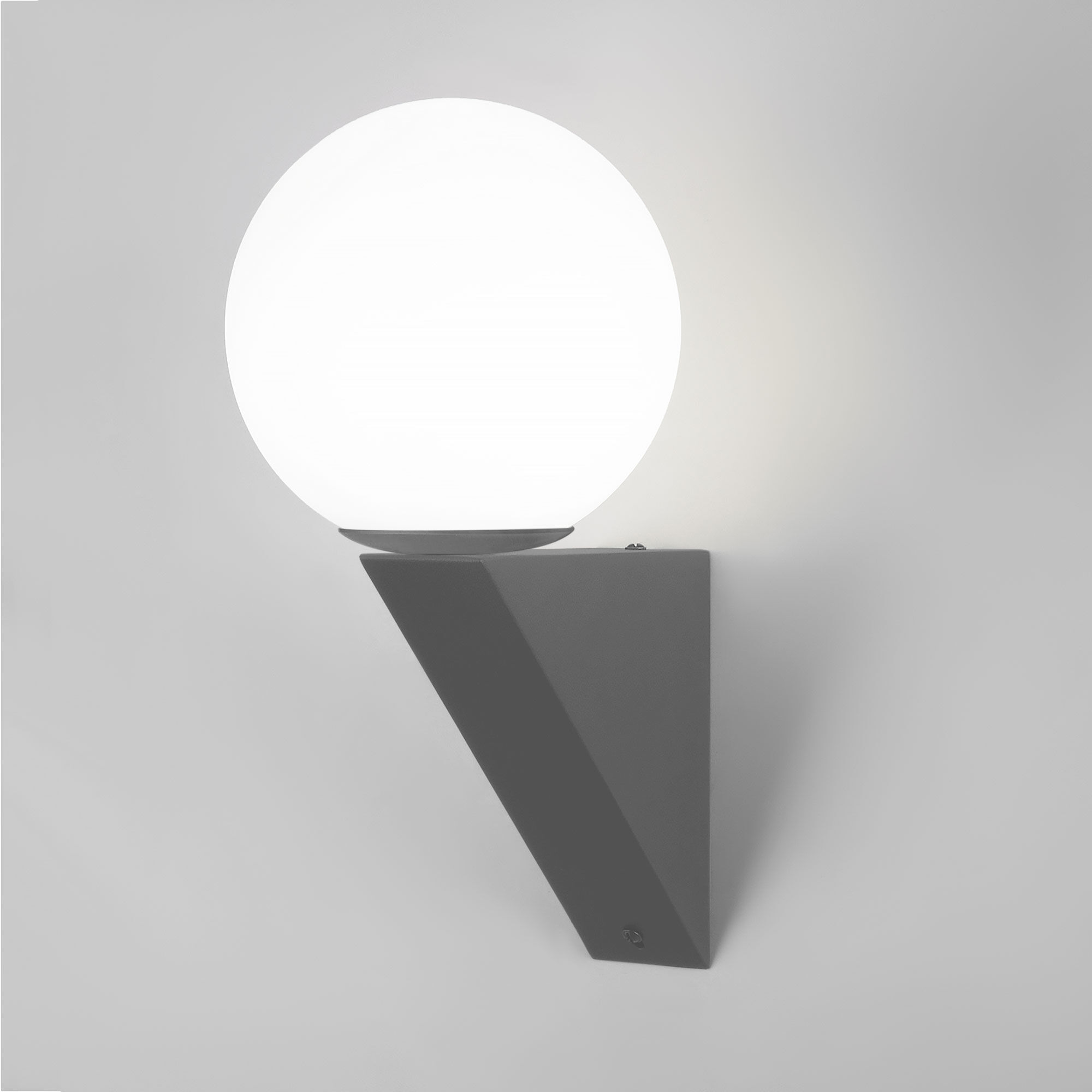 Уличный настенный светильник Gravity – это воплощение баланса геометрических форм и минимализма. Белый плафон из матового стекла обеспечивает мягкое распределение светового потока. В качестве источника света используются сменные лампы с цоколем Е14 мощностью до 40 Вт.